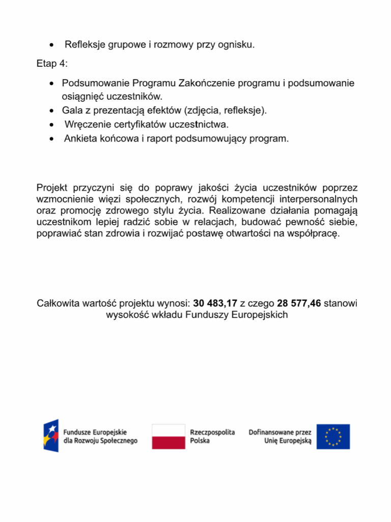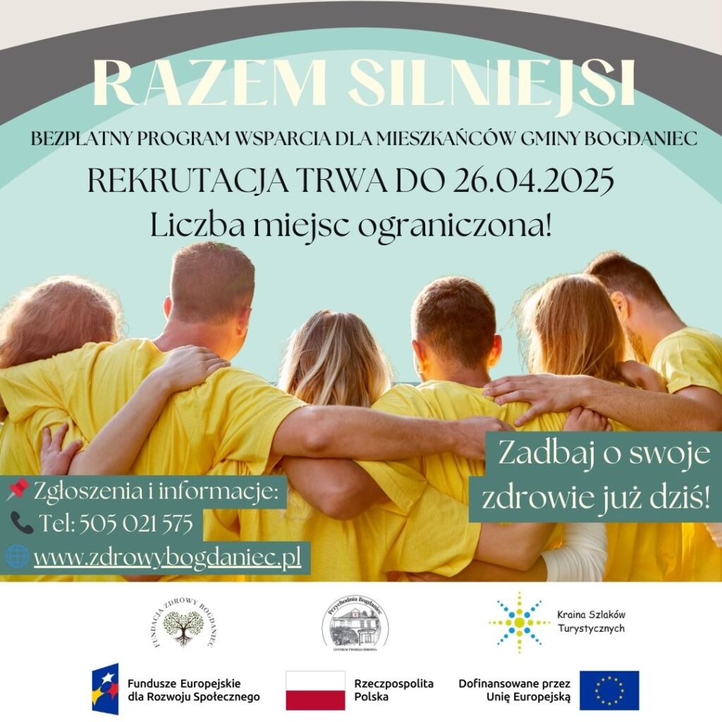 Fundacja Zdrowy Bogdaniec z radością realizuje program „Silniejsi Razem”, współfinansowany przez Europejski Fundusz Społeczny Plus. Celem programu jest wzmacnianie więzi społecznych, rozwój kompetencji interpersonalnych oraz promowanie zdrowego stylu życia, szczególnie wśród osób zagrożonych wykluczeniem i ich rodzin.